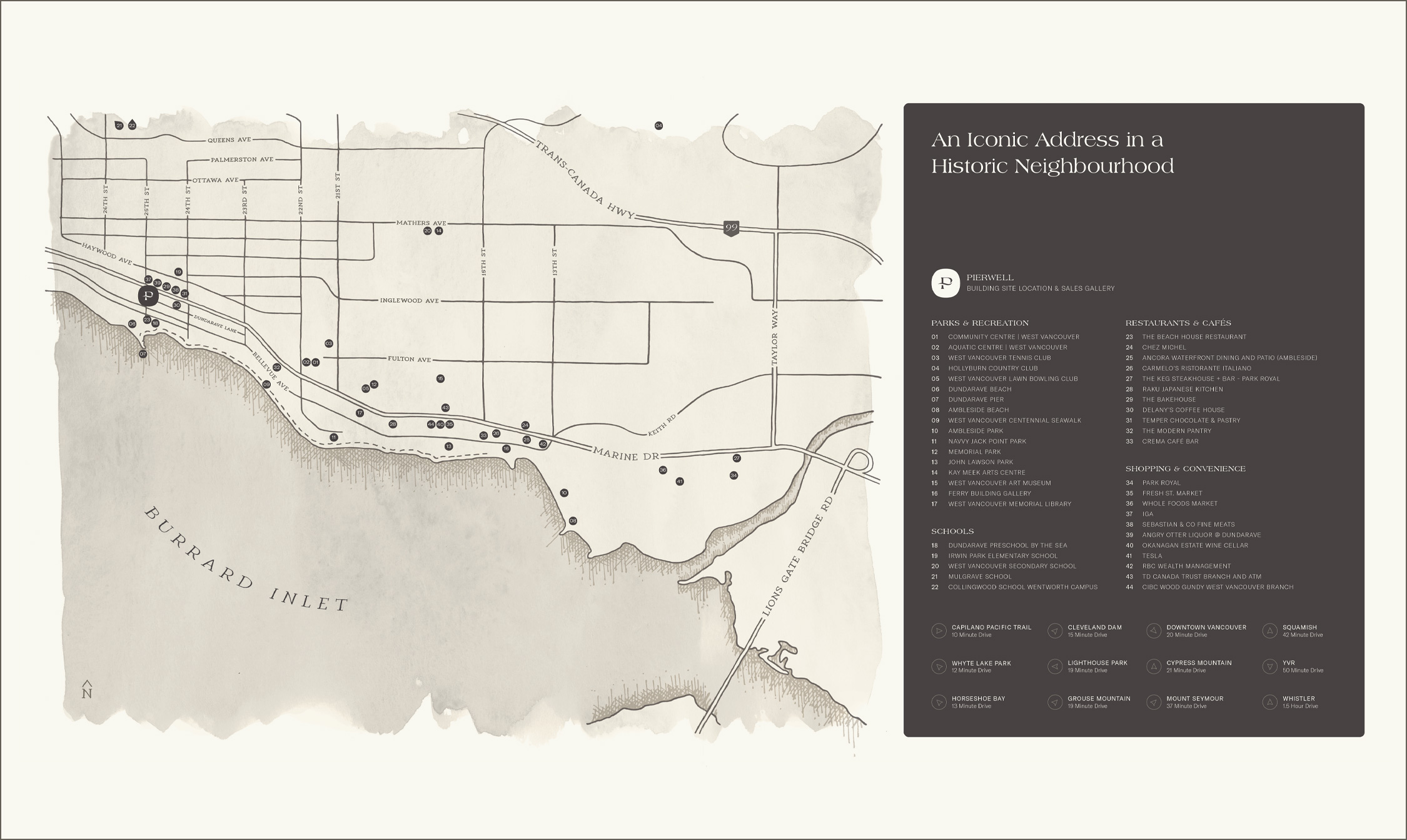 Widely known as one of the most exclusive neighbourhoods in Western Canada, Dundarave Village in West Vancouver offers a relaxing oceanside lifestyle. Pierwell will occupy one half of Dundarave's Western Gateway, with a limited number of elevated luxury residences and boutique sidewalk retail opportunities. The opportunity to call this place home is both rare and historic.